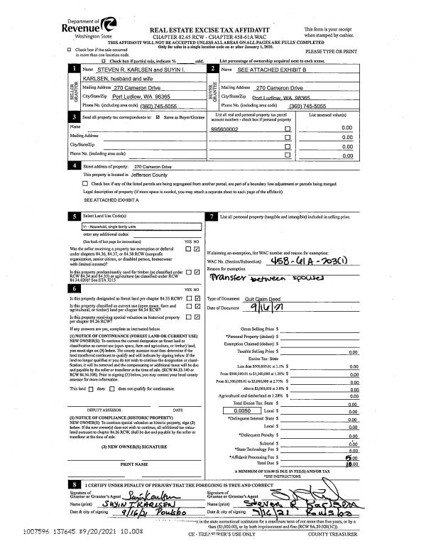 | 1 | 09/16/2021 | QCD | Quit Claim Deed | STEVEN R & SUYIN I KARLSEN | STEVEN R & SUYIN I KARLSEN | | | | 137645 | |