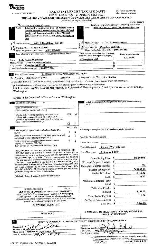 | 1 | 09/04/2018 | SWD | Statutory Warranty Deed | JOHNSTON PL INVESTMENTS LLC | SALLY JO ANN OVERHOLSER | | | $345,000.00 | 130980 | |