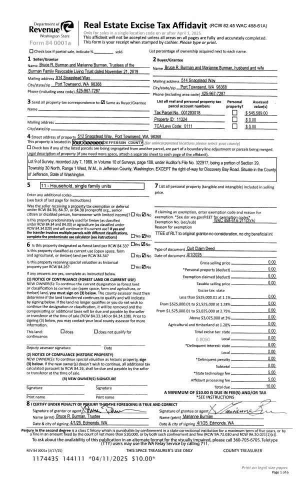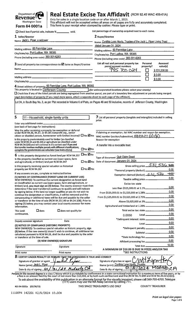 | 2 | 01/31/2024 | QCD | Quit Claim Deed | JACK L PIPER | JACK L PIPER LIVING TRUST | | | | 142201 | |