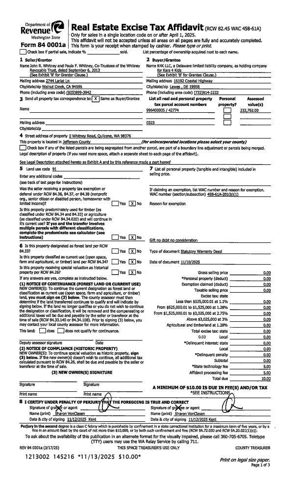 | 2 | 11/10/2025 | SWD | Statutory Warranty Deed | WHITNEY REVOCABLE TRUST | K4K LLC | | | | 145216 | |