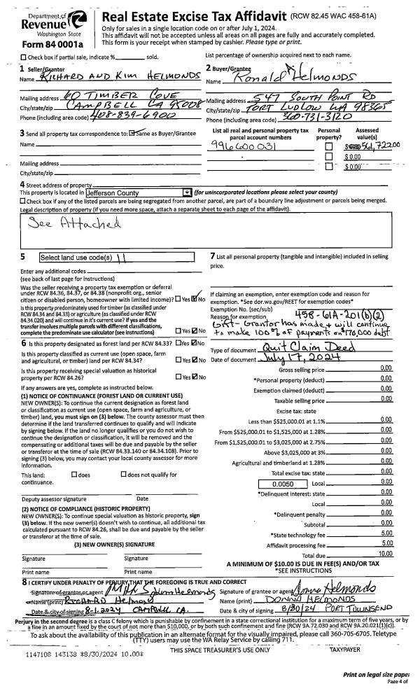 | 1 | 07/17/2024 | QCD | Quit Claim Deed | RICHARD & KIM HELMONDS | RONALD A HELMONDS | | | | 143138 | |