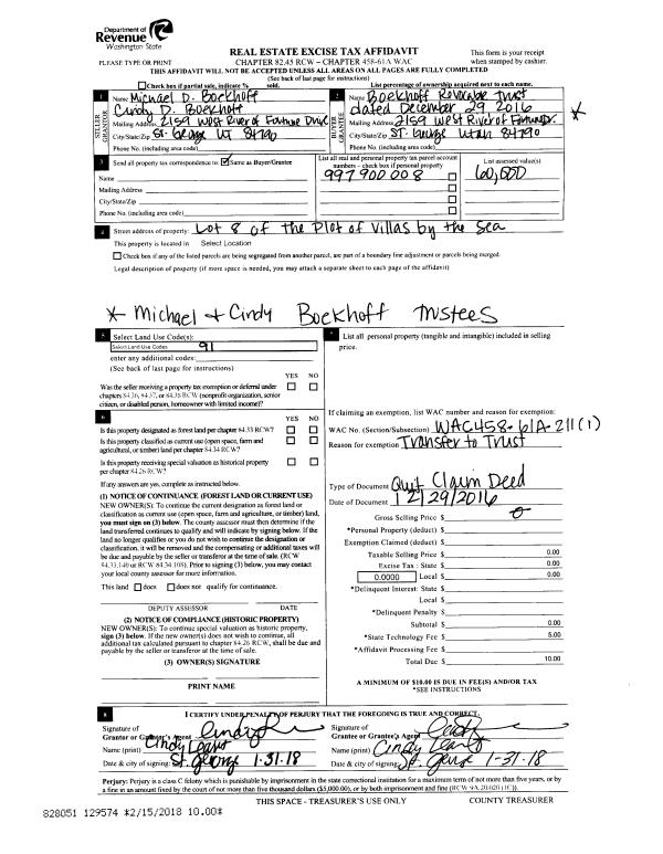 | 3 | 12/29/2016 | QCD | Quit Claim Deed | MICHAEL D BOEKHOFF | BOEKHOFF REVOCABLE TRUST | | | | 129574 | |