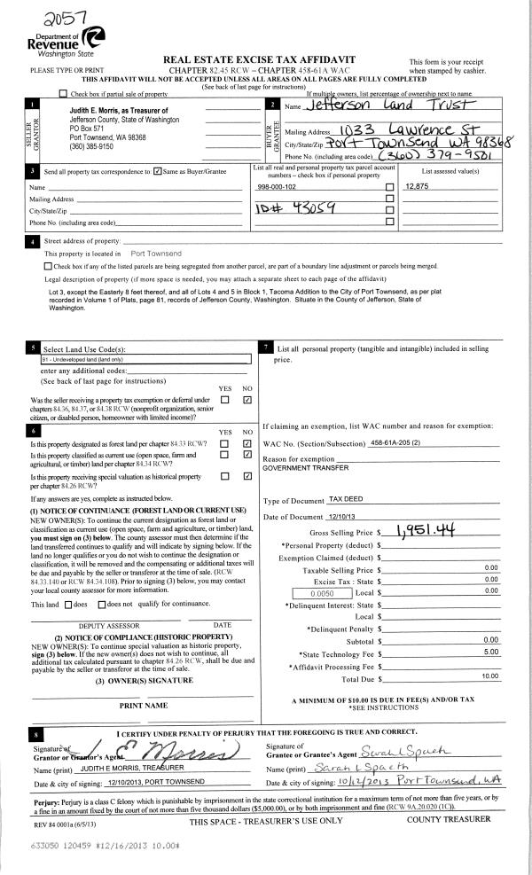 | 1 | 12/10/2013 | TXD | Tax Deed | JEFFERSON COUNTY | JEFFERSON LAND TRUST | | | $1,951.00 | 120459 | |