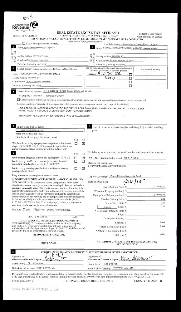 | 1 | 07/02/2015 | PRD | Personal Representatives Deed | LITZA SLEMKO | JOHN THOMAS SLEMKO | | | | 123642 | |