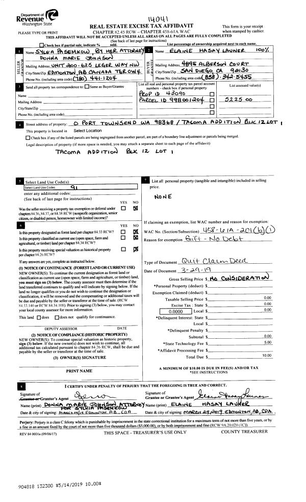 | 1 | 03/29/2019 | QCD | Quit Claim Deed | SYLVIA PASEMKOW | ELAINE H LAUNER | | | | 132300 | |