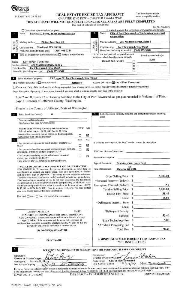 | 1 | 10/14/2016 | SWD | Statutory Warranty Deed | PATRICIA D BERRY | CITY OF PORT TOWNSEND | | | $3,000.00 | 126461 | |