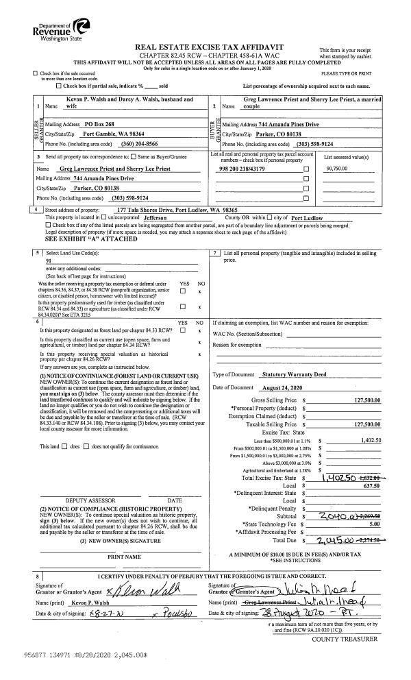 | 2 | 08/24/2020 | SWD | Statutory Warranty Deed | KEVON & DARCY WALSH | GREG L & SHERRY L PRIEST | | | $127,500.00 | 134971 | |