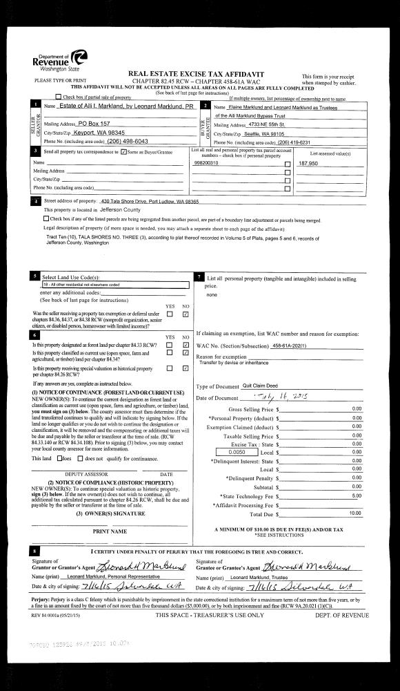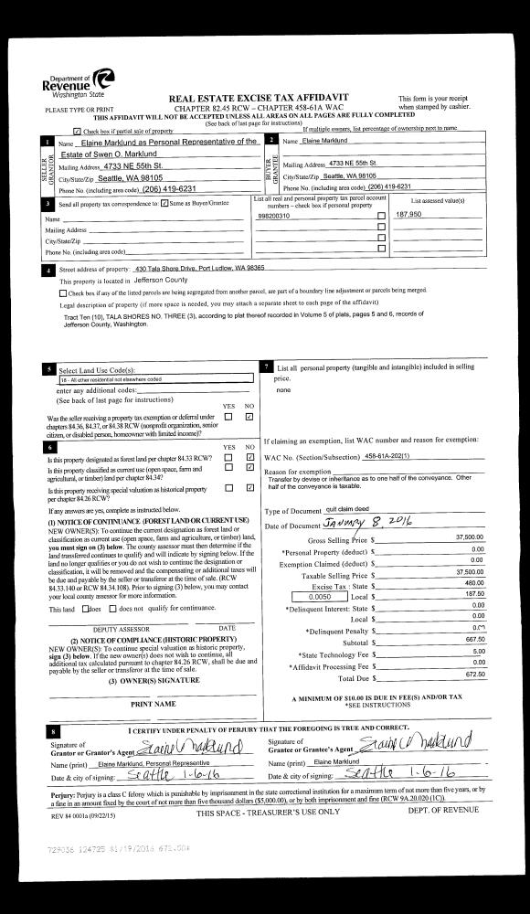 | 1 | 04/12/2019 | QCD | Quit Claim Deed | ELAINE MARKLUND | ELAINE MARKLUND & JAMES SCOTT DICKINSON | | | | 132111 | |