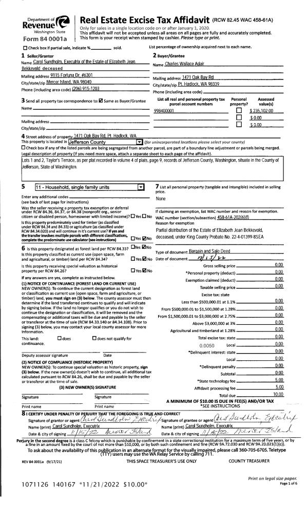 | 2 | 11/15/2022 | BSD | Bargain and Sale Deed | ELIZABETH BEKKEVOLD | CHARLES W ADAIR | | | | 140167 | |