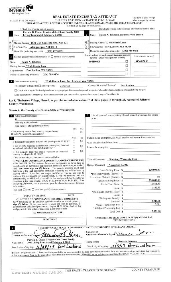 | 2 | 11/05/2013 | SWD | Statutory Warranty Deed | PATRICIA B CHASE TRUSTEE | NANCE A JOHNSON | | | $220,000.00 | 120256 | |