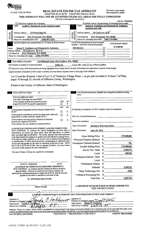 | 4 | 06/25/2013 | SWD | Statutory Warranty Deed | LYNDA C PARKHURST | DANIEL PAUL GOLDSTEIN | | | $179,900.00 | 119509 | |