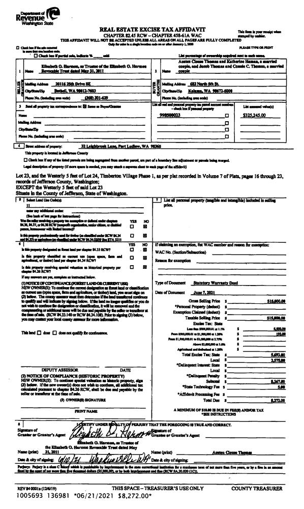 | 2 | 06/07/2021 | SWD | Statutory Warranty Deed | ELIZABETH O HARMON TRSTEE | AUSTEN THOMAS & KATHERINE HAMAN | | | $515,000.00 | 136981 | |