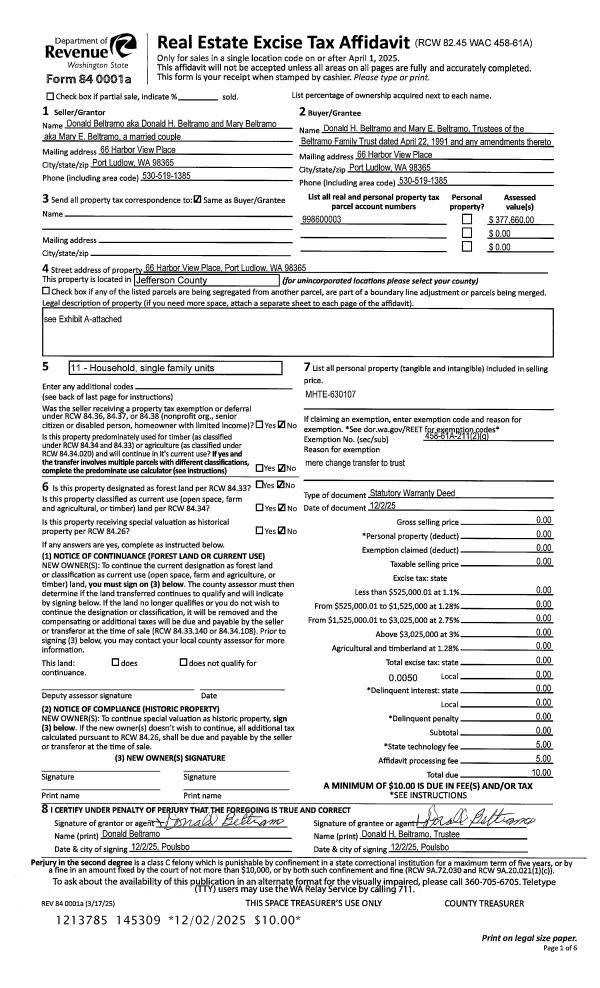 | 1 | 12/02/2025 | SWD | Statutory Warranty Deed | DONALD & MARY BELTRAMO | BELTRAMO FAMILY TRUST | | | | 145309 | |