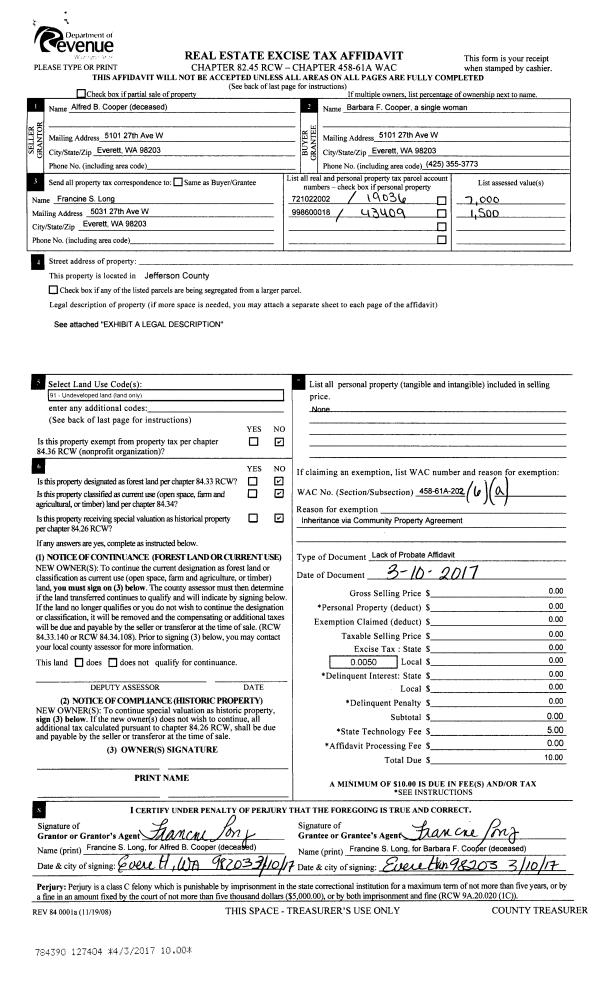 | 3 | 03/10/2017 | LOP | Lack of Probate | BARBARA F COOPER | BARBARA F COOPER | | | | 127404 | |
