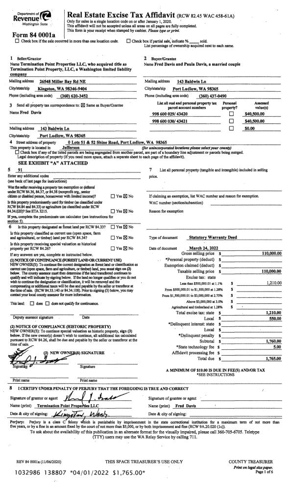 | 1 | 03/24/2022 | SWD | Statutory Warranty Deed | TERMINATION POINT PROPERTIES LLC | FREDRICK D DAVIS | | | $110,000.00 | 138807 | |