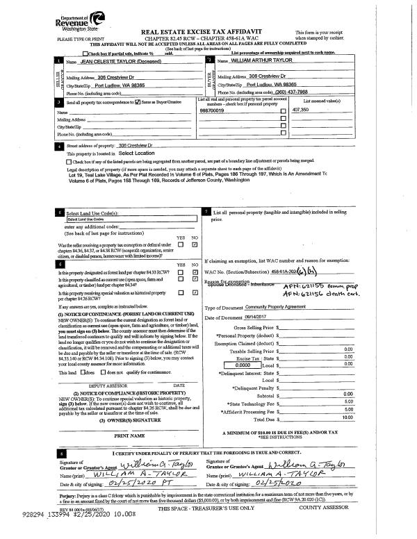 | 2 | 09/14/2017 | CPA | Community Property Agreement | WILLIAM A TAYLOR | WILLIAM ARTHUR TAYLOR | | | | 133994 | |