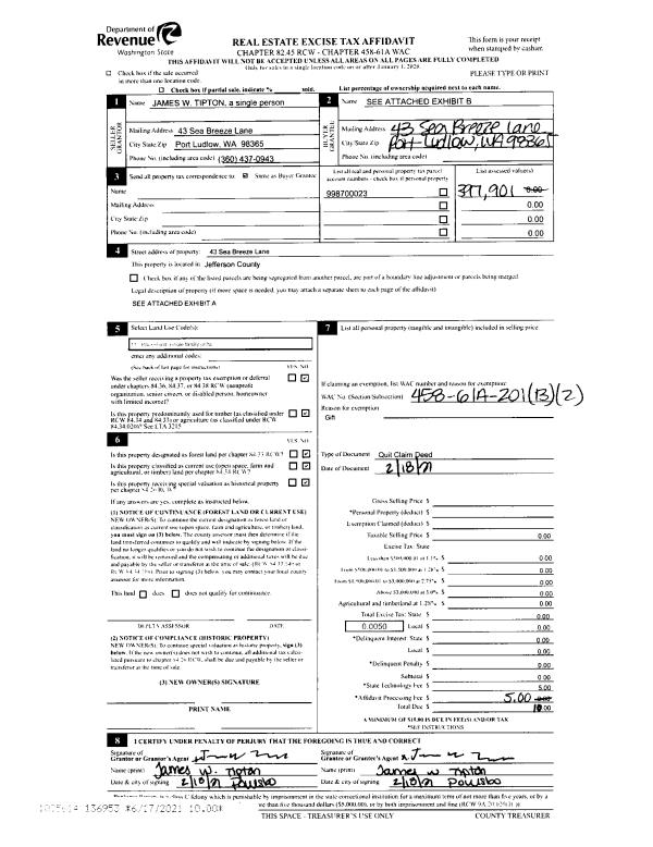 | 1 | 02/18/2021 | QCD | Quit Claim Deed | JAMES W TIPTON | JAMES W TIPTON | | | | 136953 | |