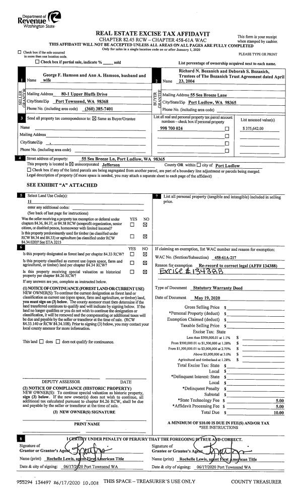 | 1 | 05/19/2020 | SWD | Statutory Warranty Deed | GEORGE F HAMSON | BOZANICH TRUST AGREEMENT | | | $455,000.00 | 134388 | |