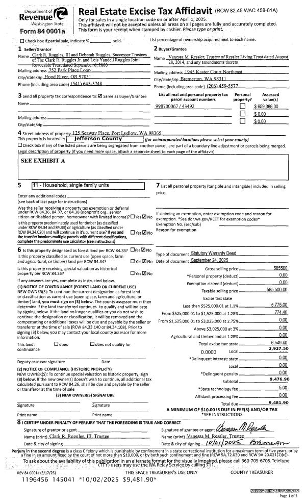 | 1 | 09/24/2025 | SWD | Statutory Warranty Deed | CLARK R RUGGLES JR TRST | RESSLER LIVING TRUST | | | $585,500.00 | 145041 | |