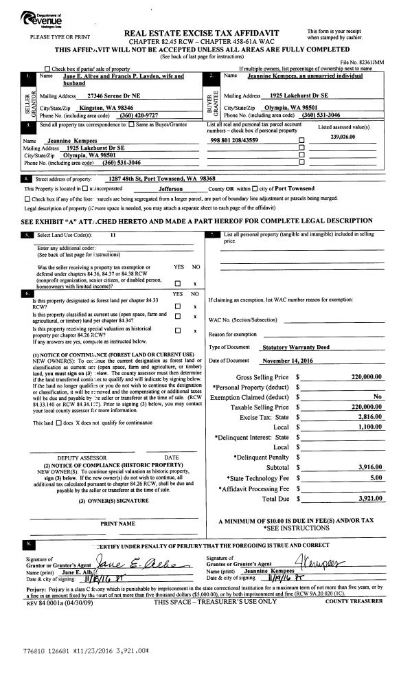 | 2 | 11/14/2016 | SWD | Statutory Warranty Deed | JANE E ALBEE | JEANNINE KEMPEES | | | $220,000.00 | 126681 | |