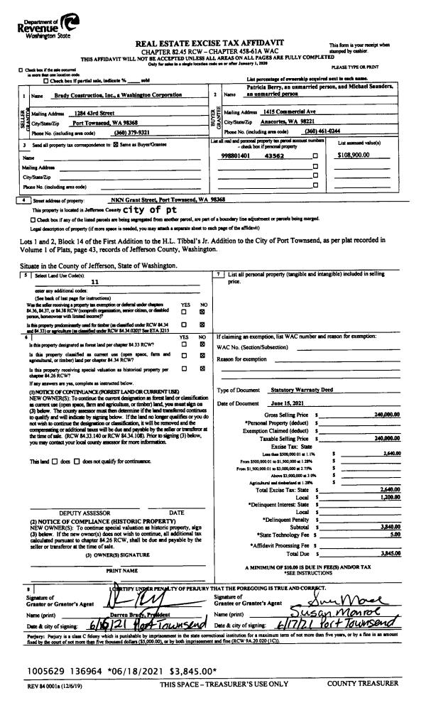 | 1 | 06/15/2021 | SWD | Statutory Warranty Deed | BRADY CONSTRUCTION INC | PATRICIA BERRY | | | $240,000.00 | 136964 | |