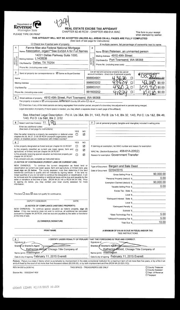 | 1 | 02/04/2015 | BSD | Bargain and Sale Deed | FEDERAL NATIONAL MORTGAGE ASSOCIATION | BRIAN PETERSEN | | | $90,000.00 | 122681 | |