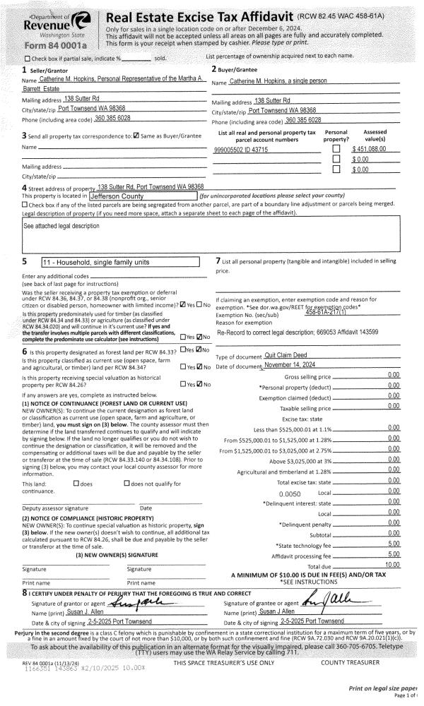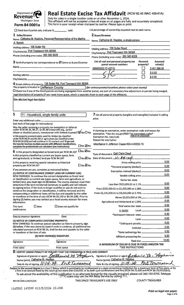 | 1 | 11/14/2024 | QCD | Quit Claim Deed | MARTHA A BARRETT | CATHERINE M HOPKINS | | | | 143599 | |