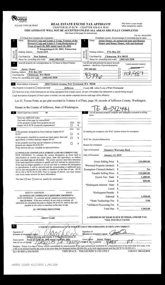 | Mailing Address: | DEANNA OSMER 2094 VICTORIA AVE PORT TOWNSEND, WA 98368-7327 | % Ownership: | 100.0000000000% |