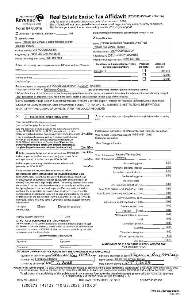 | 1 | 10/07/2025 | SWD | Statutory Warranty Deed | FRANCES S MCKAIG | FRANCES S MCKAIG REVOC LIV TRUST | | | | 145128 | |