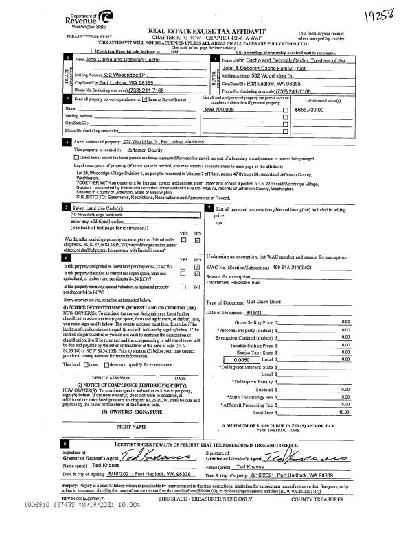 | Mailing Address: | JOHN CACHO TRUSTEE DEBORAH CACHO TRUSTEE 532 WOODRIDGE DR PORT LUDLOW, WA 98365-8236 | % Ownership: | 100.0000000000% |