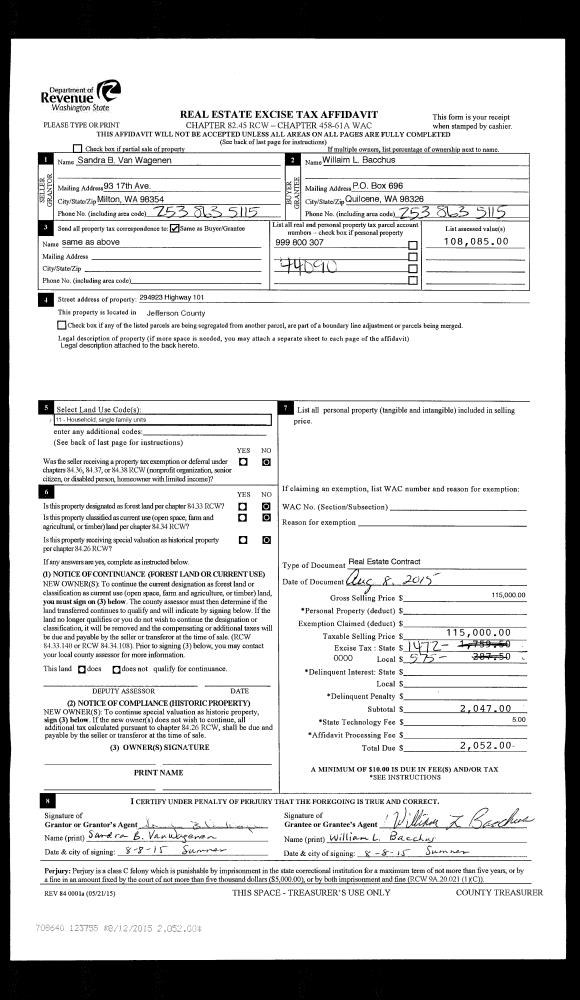 | 2 | 08/08/2015 | REC | Real Estate Contract | WILLIAM E BAILEY | WILLIAM L BACCHUS JR | | | $115,000.00 | 123755 | |