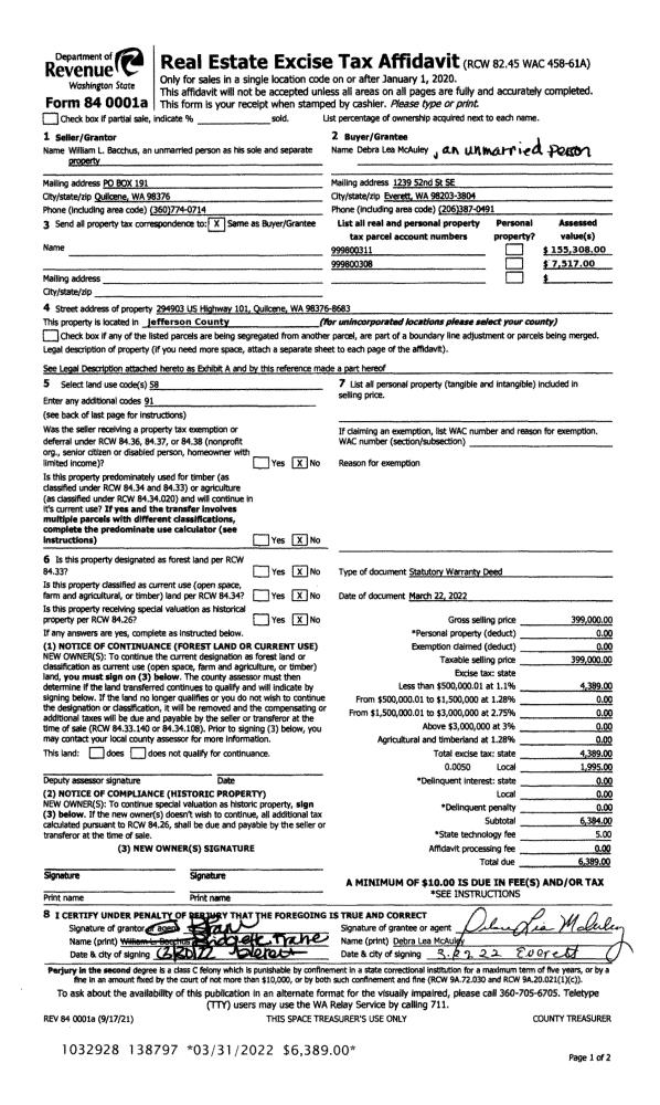 | 1 | 03/22/2022 | SWD | Statutory Warranty Deed | WILLIAM L BACCHUS JR | DEBRA L MCAULEY | | | $399,000.00 | 138797 | |