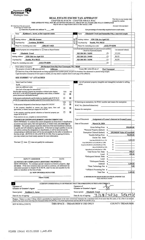 | 2 | 10/28/2020 | BSD | Bargain and Sale Deed | HOMEWARD BOUND | CITY OF PORT TOWNSEND | | | | 135447 | |
