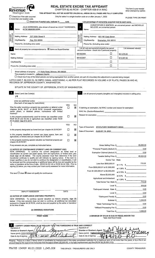 | 3 | 11/09/2012 | SWD | Statutory Warranty Deed | KITSAP BANK | TOROK, AMY/TAMMY | | | $105,000.00 | 118336 | 0 |