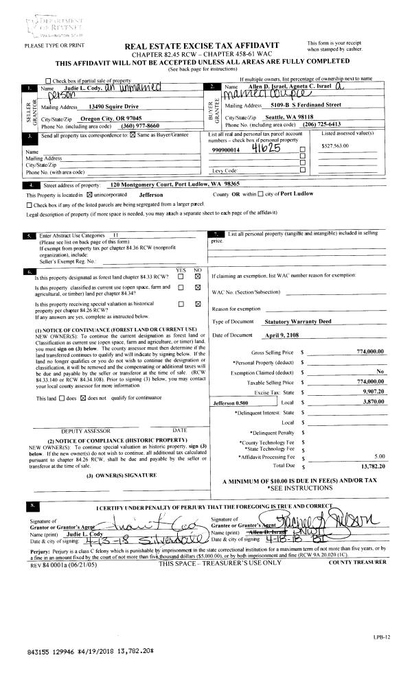 | Mailing Address: | KIM S LEIGH 2250 HASTINGS AVE W PORT TOWNSEND, WA 98368-9639 | % Ownership: | 100.0000000000% |