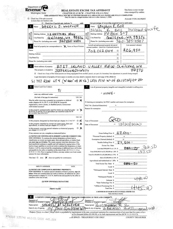 | 4 | 04/30/2013 | SPWD | Special Warranty Deed | QUIMPER COMMUNITY FEDERAL | KRISTINA CARLSON | | | $83,500.00 | 119198 | |