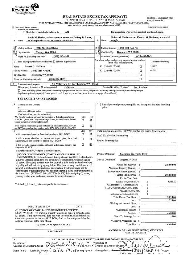 | 1 | 12/16/2021 | SWD | Statutory Warranty Deed | PACIFIC FUNDING 50% | CITY OF PORT TOWNSEND | | | $1,330,000.00 | 138261 | |