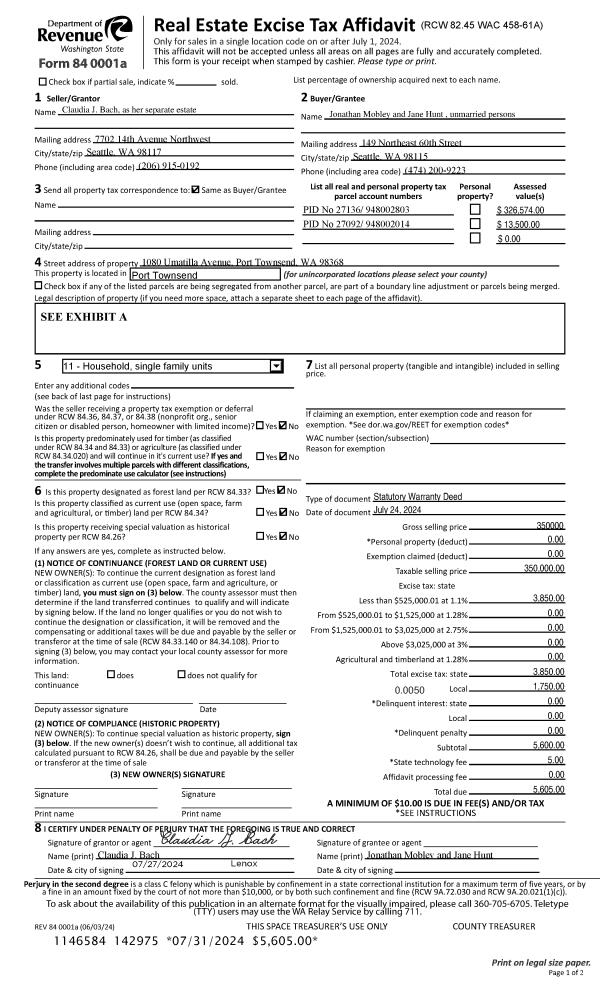 | 1 | 05/30/2024 | SWD | Statutory Warranty Deed | CAROL L CAHILL TRUST | KEN ROGERS | | | $750,000.00 | 142693 | |