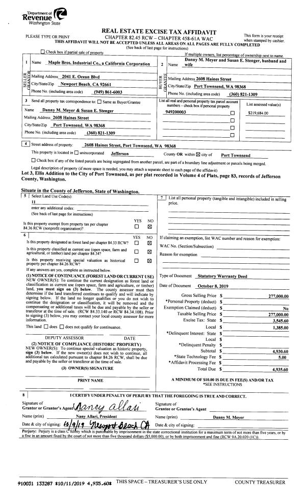 | Mailing Address: | REBECCA B & DALE NIENOW TRUSTEES 988 BLAINE ST PORT TOWNSEND, WA 98368-5412 | % Ownership: | 100.0000000000% |
