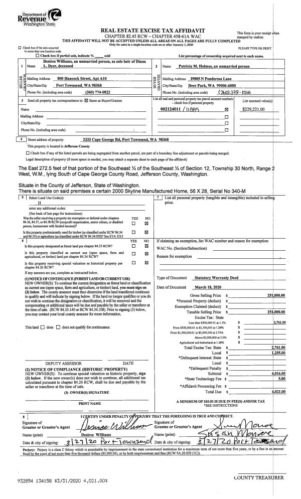 | 1 | 10/23/2020 | SWD | Statutory Warranty Deed | THERMIONICS NORTHWEST INC | JOHNPAUL DAVIES | | | $235,000.00 | 135450 | |