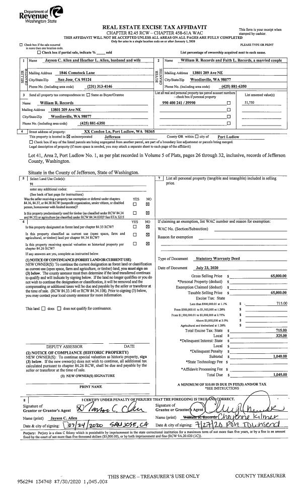| 1 | 01/20/2021 | REC | Real Estate Contract | WILLIAM S MARLOW | BRUCE B SETON JR | | | $425,000.00 | 135956 | |