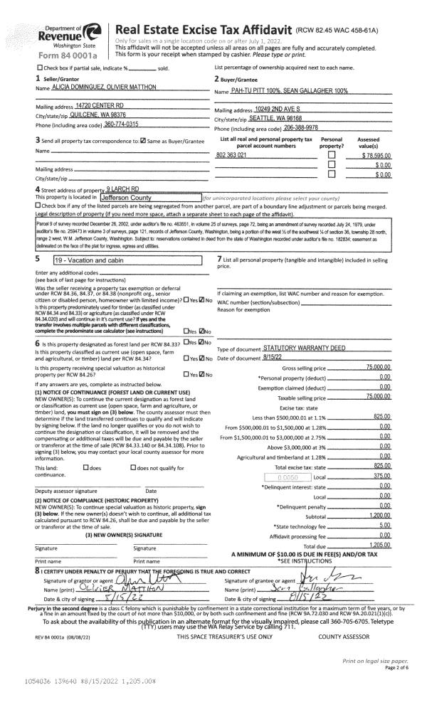 | 6 | 08/10/2005 | EASE | Assignment of Easement | TICE, JACK L | PUGET SOUND ENERGY INC | 0 | 0 | $644.00 | 104563 | 0 |