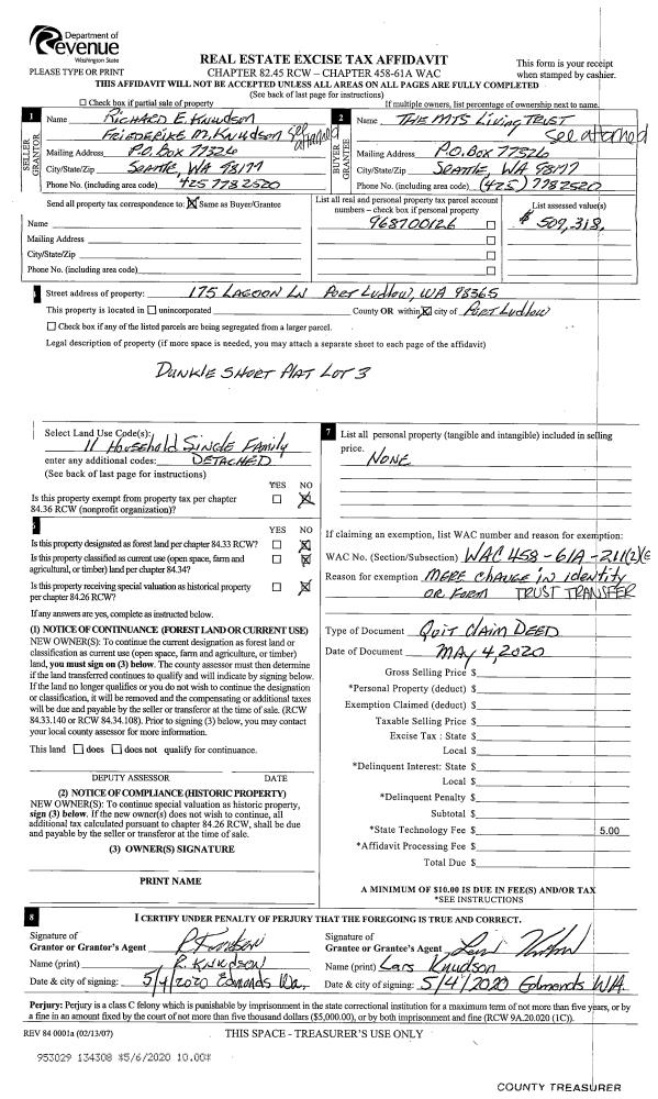 | Mailing Address: | JOHN F GATCHET TRUSTEE ELOISE M GATCHET TRUSTEE 832 GARDINER BEACH RD SEQUIM, WA 98382-8751 | % Ownership: | 100.0000000000% |