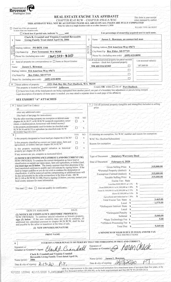 | 1 | 10/21/2020 | SWD | Statutory Warranty Deed | DIANE DERRICK | DONELLE ODREN & MELISSA SHARP | | | $250,000.00 | 135434 | |
