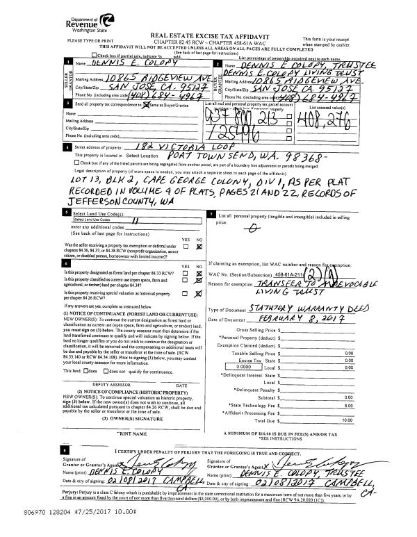 | 6 | 12/14/2001 | TXD | Tax Deed | JEFFERSON COUNTY, A WASHI | ROSE JR., LOREN DON | 0 | 0 | $610.00 | 93684 | 0 |