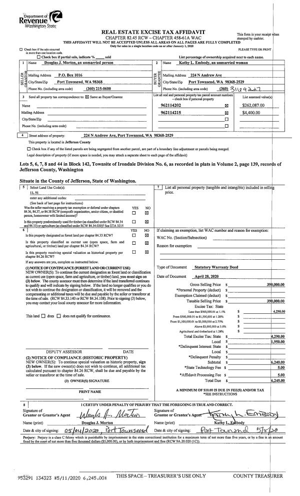 | 2 | 05/03/2018 | SWD | Statutory Warranty Deed | RANDALL L PETITE | ERIC & MELANIA HUDSON | | | $100,000.00 | 130103 | |