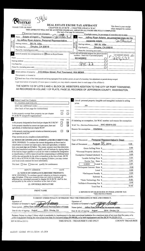 | Mailing Address: | 5003 MAIN ST #207 TACOMA, WA 98407-3172 | % Ownership: | 100.0000000000% |