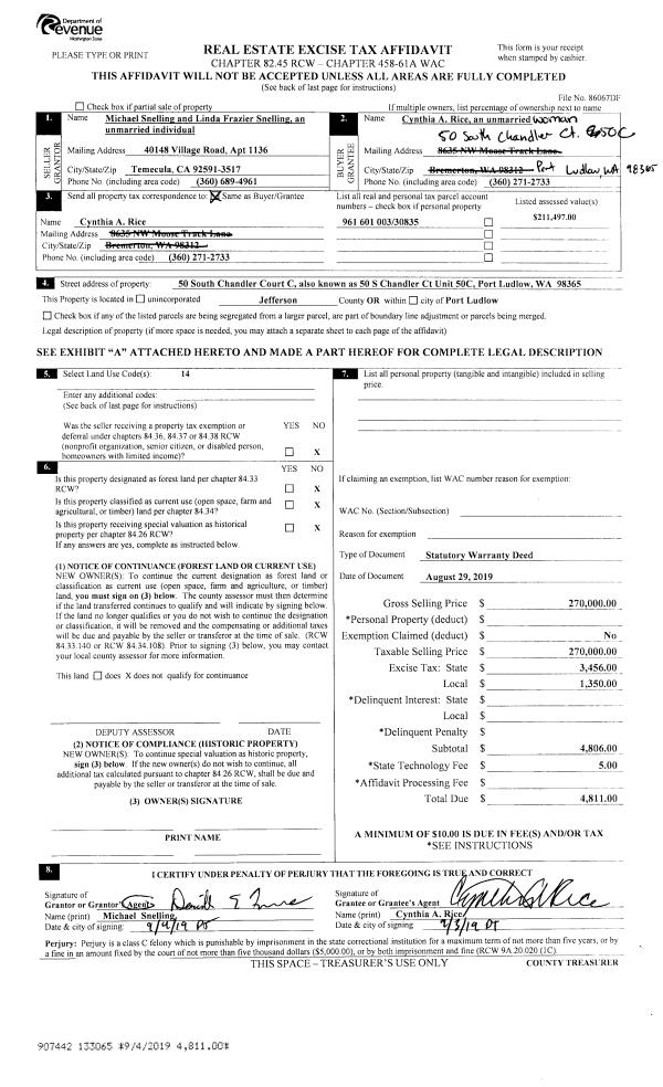 | 1 | 12/23/2020 | SWD | Statutory Warranty Deed | CLAUDETTE M CROWELL | ERIC L & DENA M FREDRICKSON | | | $335,000.00 | 135769 | |