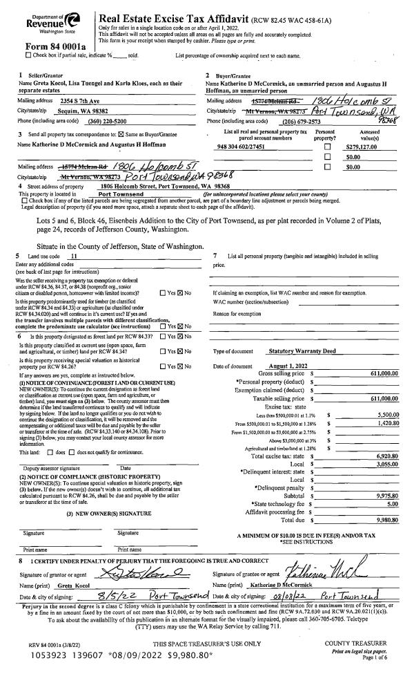 | Mailing Address: | 1033 LAWRENCE ST PORT TOWNSEND, WA 98368-6523 | % Ownership: | 100.0000000000% |