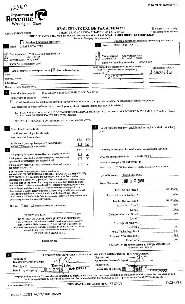 | 2 | 06/27/2018 | BSD | Bargain and Sale Deed | US BANK NATIONAL ASSOCIATION | BRIAN HOCTOR | | | $193,200.00 | 130470 | |